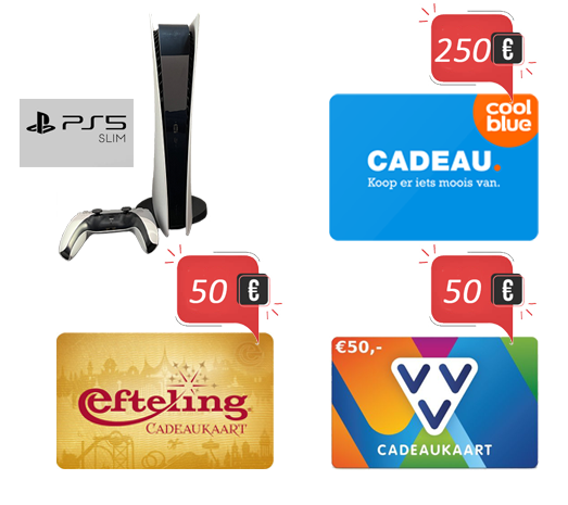 ‘Maak kans op een Cool Blue Cadeaubon t.w.v. €250,-. Of op een PlayStation 5. Of op een Efteling of VVV Cadeaubon t.w.v. €50,-